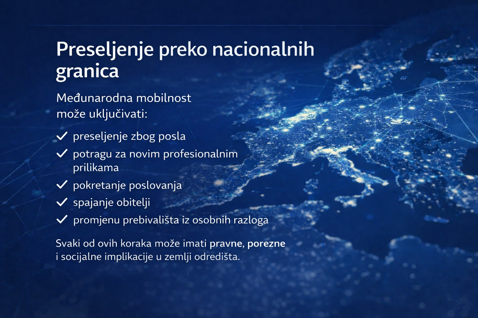 Svaki odabir — profesionalni, poduzetnički ili osobni — može imati učinke u zemlji porijekla i odredišnoj zemlji. Ispravno razumijevanje primjenjivog pravnog okvira ključan je element za planiranje strukturiranog i održivog procesa mobilnosti.