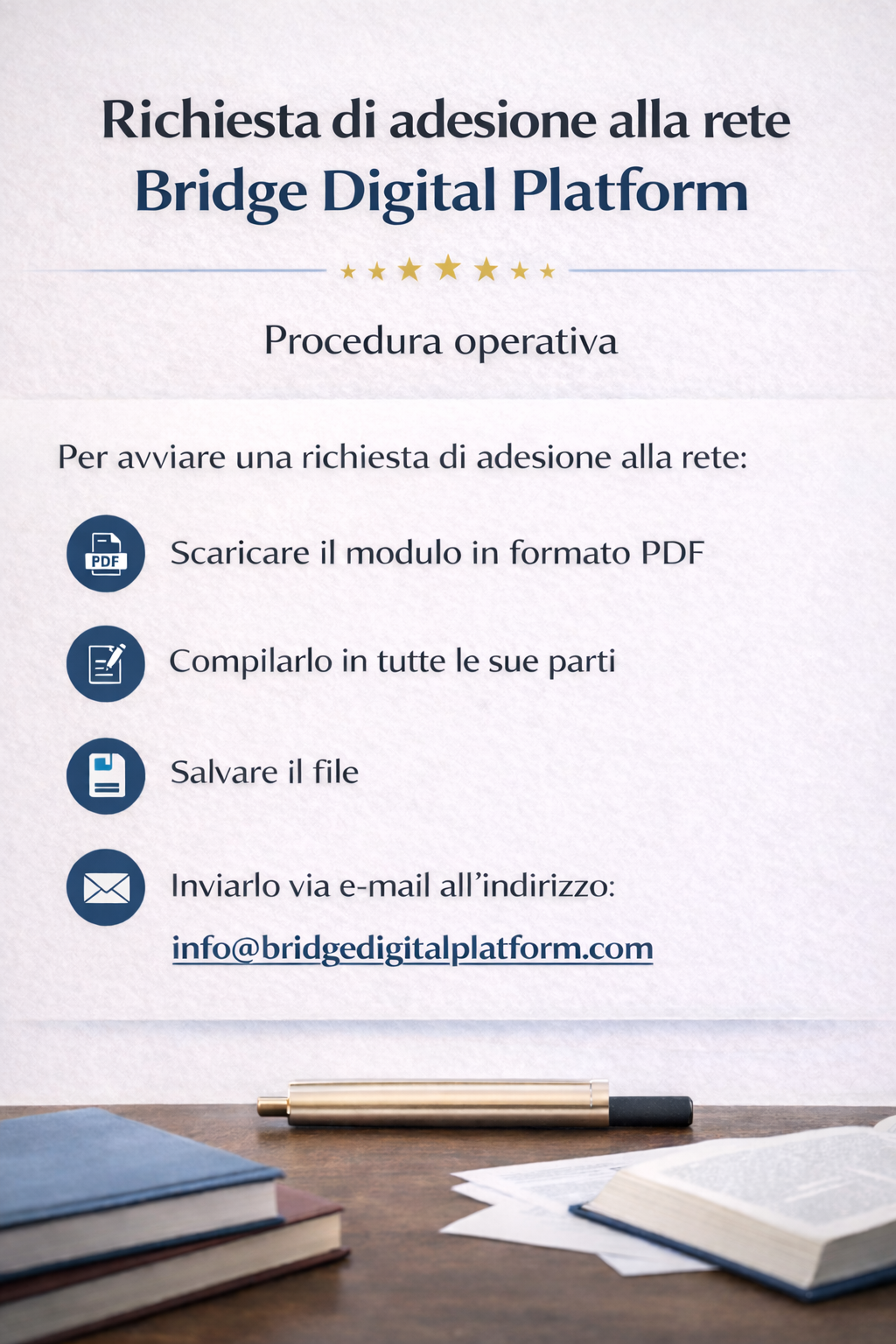 La compilazione e l’invio del modulo di richiesta non comportano l’automatica ammissione alla rete Bridge Digital Platform.